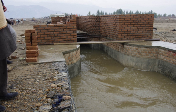 サイフォン下流端。上流端からの落差1.7m、計算通り毎秒1.6m3の豊富な水量を送る。スランプール地域とほぼ等量