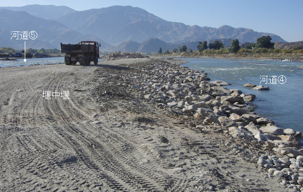 交通路が確保できるのは、最初の数十メートルで、あとは掘削機を並べて、巨礫のリレーしかない。熟練は要るが、かなり確実な方法。低水位期に、短期決戦で一挙に終わらせるのがコツ。用水路工事の中で最も重要なのが堰の造成だ。予算も食う。