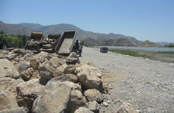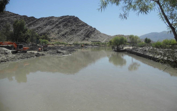 マルワリード用水路約7㎞地点、通称H2貯水池の浚渫風景。建設からまる8年、集中豪雨の鉄砲水から里を守ってきた。今回、本格的な土砂浚渫を行っている。堆積した泥土は肥沃で、近傍に集積しておけば住民が自分の畑に持ち去る。