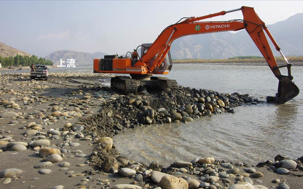 ミラーン堤防から150m上流、旧水制の撤去と改修。国道脇が深くえぐられ、低水位でも4~5mの水深であった。一般に、水制の越流部は、長軸に対して直角に流方向を変える。軟弱地盤に下向きに水制を置くのは禁忌である。