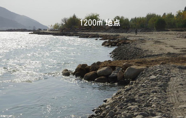交通路敷設は侵食部に沿い、25m間隔で小水制を置きながら、砂利流失を防ぎつつ行われた。