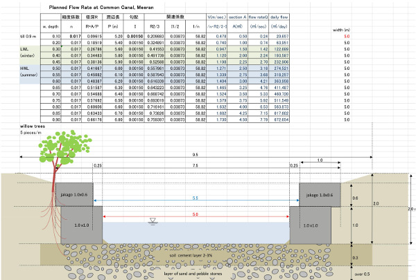 主幹水路のライニングが進められている。ライニングは目立たないが水路の基礎である。シルトや細砂を砂利に置換し、厚さ30㎝以上でソイルセメントを使用、10m毎に1.5㎝の傾斜をとる。このライニング法がPMSの定番、0.0015の傾斜は経験的に得た値で、砂をよく押し流すと共に急流に耐える。