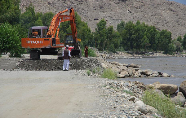 ミラーン堰護岸始点のかさ上げ工事。これによって溢水の危険は遠のいたが、現在逆に低水位が問題になってきている。2015年7月20日
