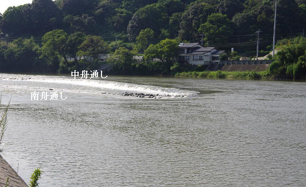 平皿状の堰体構造は、山田堰(中舟通しと南舟通しとの間の堰体)でも見られる。辺縁を盛り上げた作りにすると、低水位時に水が逃げず、高水位 時には辺縁直下で掃流力が減殺され、下流側の堰体を保護する。越流線の高さを水門のレベルにして水平に湾曲した弧を描けば、流水が堰体の中央に集まる。両岸へかかる負荷も減る。なお、斜めに横断する堰幅は170mだが、越流線を複数に分割することで、「機能的な堰幅」は更に長い。驚くべきもの。2013年8月27日