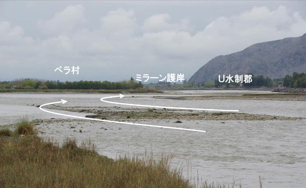 対岸の測量で、ミラーンとの位置関係が明確になりました。概念図ですが、これがより正確です。砂州4と5は癒合していて、河道の痕跡で分かれているだけです。かなり激しい河道変化が起きていて、2014年秋とはずいぶん変わっています。今後、これを元にして報告書を記載します。(なおU水制群のうち、U5は元のままで、U1~U4(400m)がPMSの工事です)。