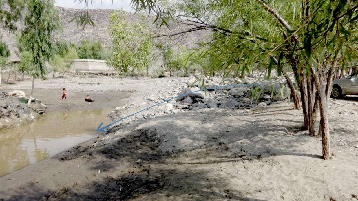 ▼マルワリード用水路N区。巨石や土砂で完全に埋まっているが、用水路両側の成長した柳で用水路の位置がわかる。