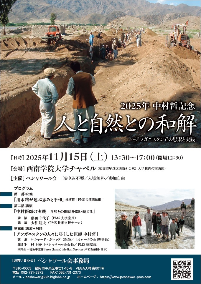 お問い合わせはペシャワール会事務局までお願いします。西南学院大学へのお問合せはご遠慮ください。チラシ詳細((pdfファイル全2ページ)はこちら»主催
